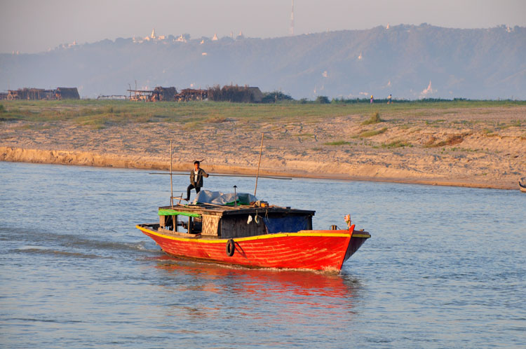 Stipt om zeven uur in de ochtend vertrekken we voor een tocht van elf uur over de rivier de Irrawaddy. De eerste uren is het steenkoud aan dek, fleeces aan. In het ochtendlicht komen de kleurige scheepjes op de rivier en de bouwsels op de oevers prachtig uit.