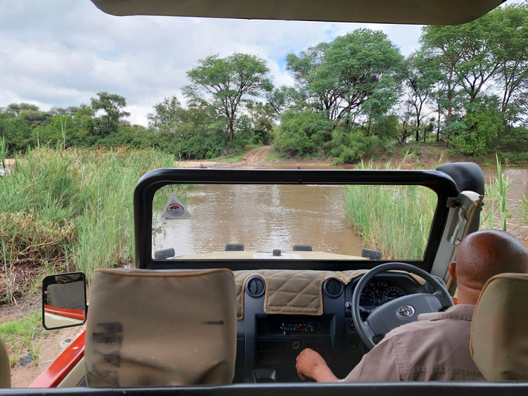 Henry, de manager van de lodge, staat erop dat we de rivier niet oversteken op onze blote voeten. Hij zet ons over in zijn Toyota en geeft ons een walkie-talkie mee zodat we hem kunnen oproepen als we bij het tweede oversteekpunt zijn.