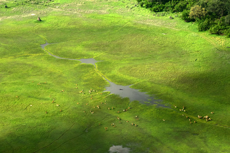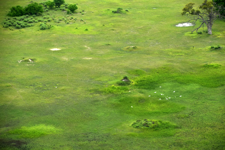 We vliegen eerst over een niet al te interessant stuk land alvorens we de delta bereiken. Jammer genoeg is het waterpeil in de delta vanwege het seizoen erg laag. De delta wordt niet gevoed door overvloedige regens maar door water uit het noorden. Laag water betekent dat er ook minder dieren te zien zijn, die zitten meer noordwaarts.