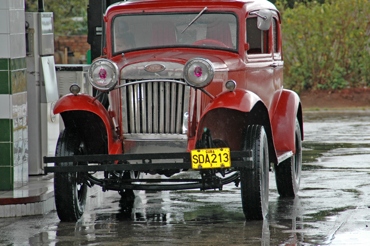 In de middag willen we naar de valle de los Ingenios. Voor we er zijn barst er een heftige tropische regenbui los. We gaan direct terug naar La Boca. Eerst even tanken en jawel ook een oud Fordje (model B) heeft benzine nodig. Als je goed kijkt zie je Che in de koplampen.