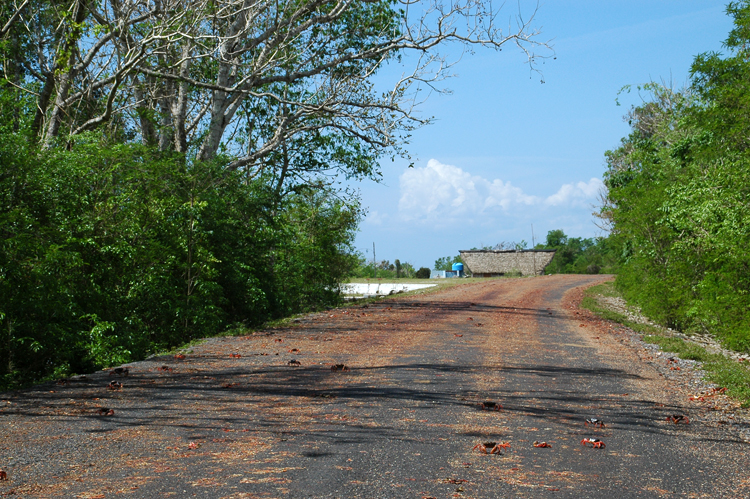 María la Gorda (Dikke Maria) ligt in het parque nacional peninsula de Guanahacabibes (iets voor scrabble?). Vlak bij de ingang van het park moet Mar vol in de remmen. Het is ook hier krabbentijd! De roze laag op de weg zijn platgewalste krabben en dat stinkt ontzettend, ramen dicht...