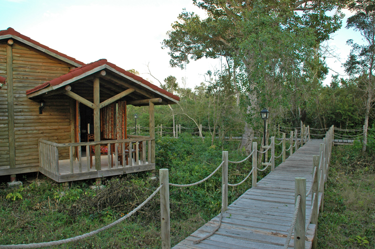 María la Gorda is geen echt dorp maar eigenlijk een hotel. We hebben geluk, er is nog accomodatie beschikbaar. En niet eens in een kamer, maar een eigen "jungalow". De jungalows zijn te bereiken via een houten loopbrug en zijn ontzettend luxe. We hebben ook een leuk balkonnetje.