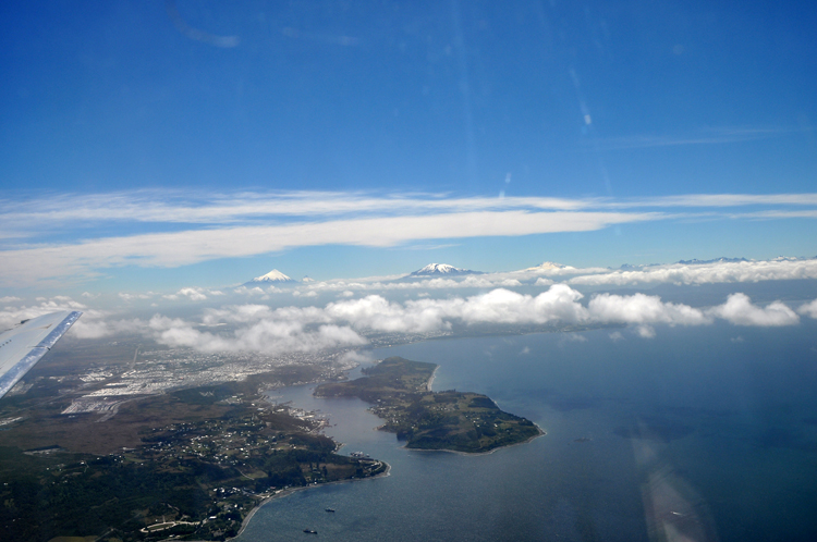 Een bumpy ride, zo kan je de vlucht naar Punta Arenas met een tussenlanding in Balmaceda kenschetsen. Het uitzicht daarentegen mag er zijn. We vliegen over de vulkanen die we gisteren achter een glas wijn mochten bewonderen, de Osorno (links) en de Calbuco.