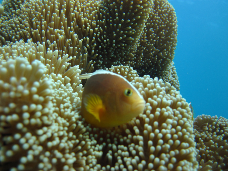 Om half drie komt Jacques, de divemaster, ons ophalen. Peet gaat duiken en Mar gaat snorkelen. We zijn heerlijk bezig op en onder water waar het weer een wondere wereld is. Zo zijn er zeeegels, anemonen en tussen de anemonen, hoe kan het ook anders, anemoonvisjes .