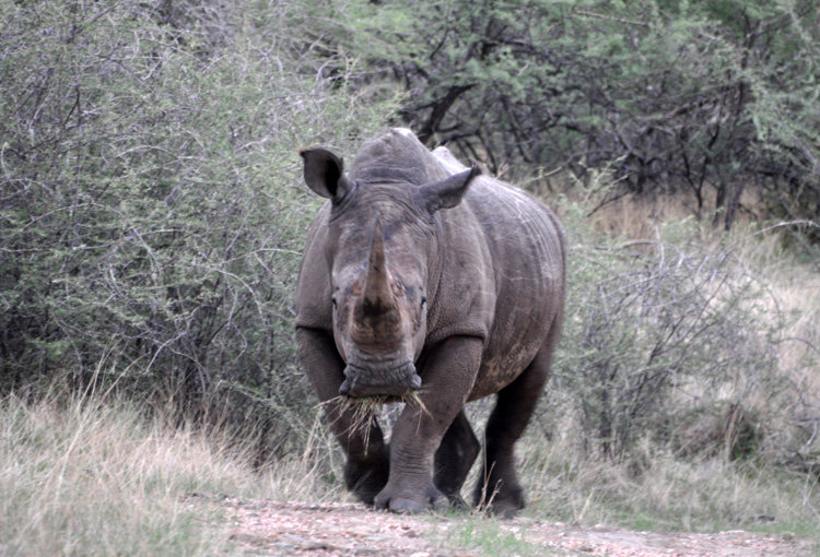 Er lopen vier witte neushoorns rond waarvan we gelukkig er eentje te zien krijgen. Dit acht jaar oude exemplaar vond het nodig om zich eerst achter bosjes te verstoppen en pas na een kwartiertje klaar te staan voor de foto. Maar dan heb je ook wat!