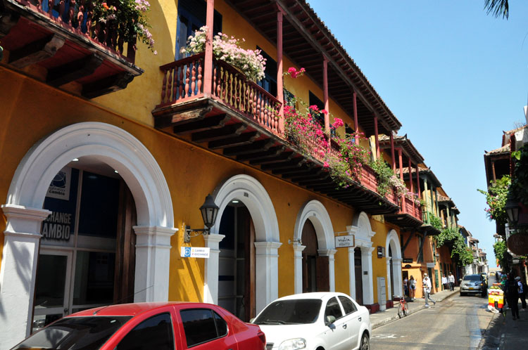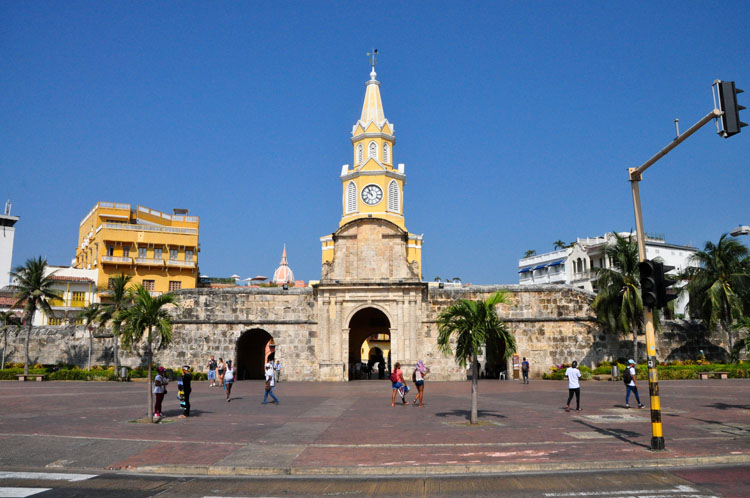 De toegangspoort tot het oude centrum in het ochtendlicht. Onder de poort wordt van alles verhandeld zoals bijvoorbeeld boeken in allerlei talen en oude Colombiaanse elpees.