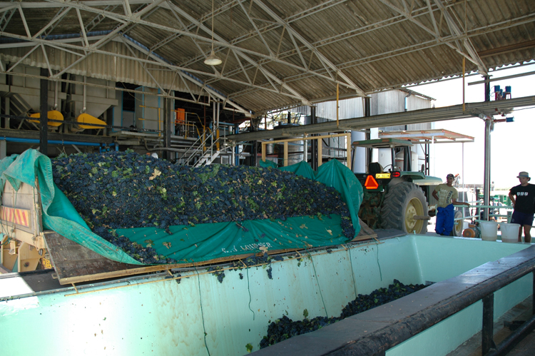 Aan het eind van de middag gaan we weer terug naar de Riebeek cellars. De oogst is in volle gang, de tractoren en vrachtwagens rijden af en aan met druiven.