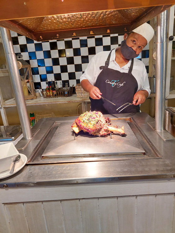 's Avonds genieten we van een dinerbuffet. En ja, er is ook weer lamsbout, geen ontkomen aan in de Karoo. De glimlach achter het mondkapje maakt veel goed.