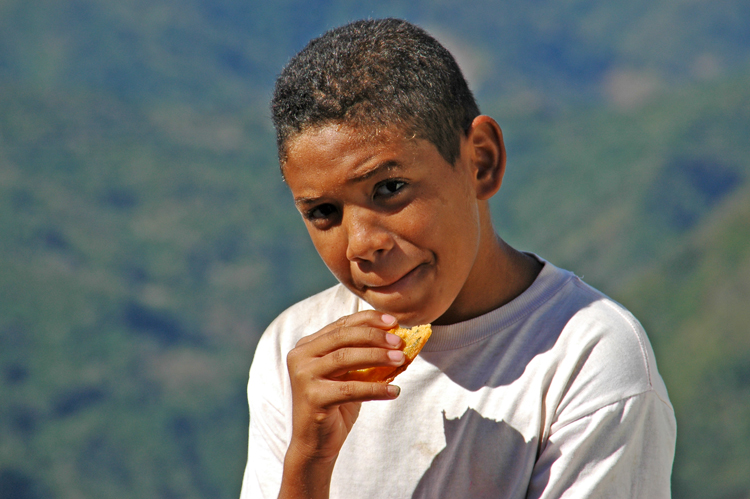 We stoppen langs de kant van de weg bij een tentje en drinken een kop koffie. Daar zitten ook deze twee kinderen.