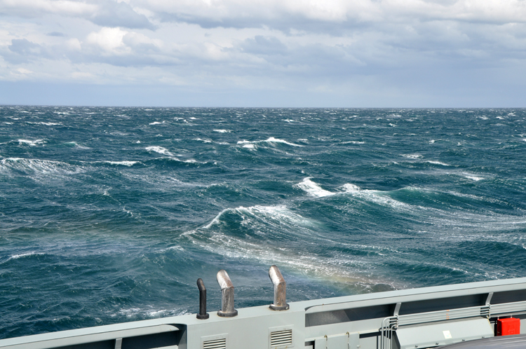 Langzaam nemen de storm en de deining af. We laten het slechte weer achter ons. Die bui in de verte krijgen we alsnog over ons heen als we eenmaal aan de overkant in Porvenir zijn aangeland.