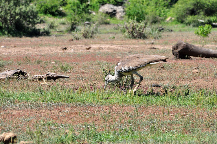 Mapungubwe is beroemd om zijn vogels. Hieronder een koritrap (gompou in het Afrikaans) daar weer onder een soort reiger.